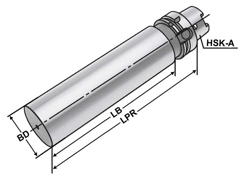 Borrstångsämne för tillverkning av egna verktyg HSK-A 50 (ISO 121164-1/DIN 69893-1). Mått Diameter (BD) 50,5 mm, utstick (LPR) 200 mm, bearbetningsbar längd (LB) 158 mm.