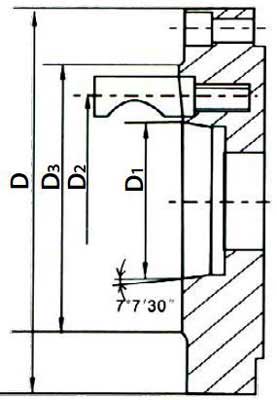 Chuckfläns i stål enligt DIN 55029 (Camlock), kona 6. Diameter (D) 315 mm, Diameter kona (D1) 106,375 mm, Bultcirkel (D2) 133,4 mm, Diameter (D3) 181 mm.