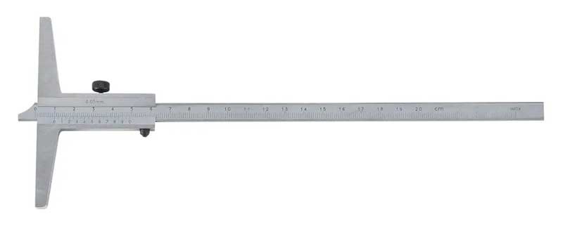 Djupskjutmått 0-200 mm med bygellängd 100 mm. Nonieskala 0,05 mm. Låsning med ställskruv. Mätskena 10x3,5 mm. Enligt ISO 13385-1. Av rostfritt stål.