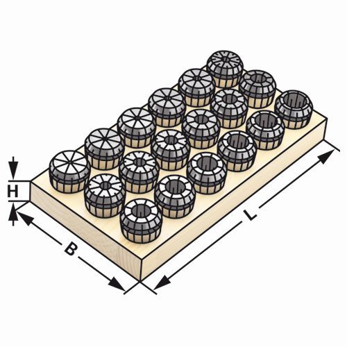 Spännhylssats med tätade hylsor för invändig högtryckskylning max 120 bar, ER25 typ 430E, DIN 6499, Form B (ER/ESX), rundgångsnoggrannhet 0,015 mm. 14 hylsor 3-4-5-6-7-8-9-10-11-12-13-14-15-16 mm på träbricka 150x195x25 mm.