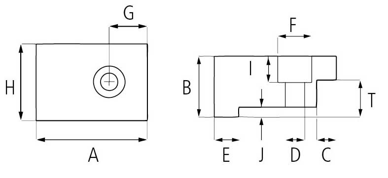 För Diesella GT-skruvstycken. Mått A 50 mm, B 25 mm, C 8 mm, D 8 mm, E 10 mm, F 14 mm, G 17 mm, H 34 mm, I 11 mm, J 4 mm, T 15 mm. 4 st/förpackning.