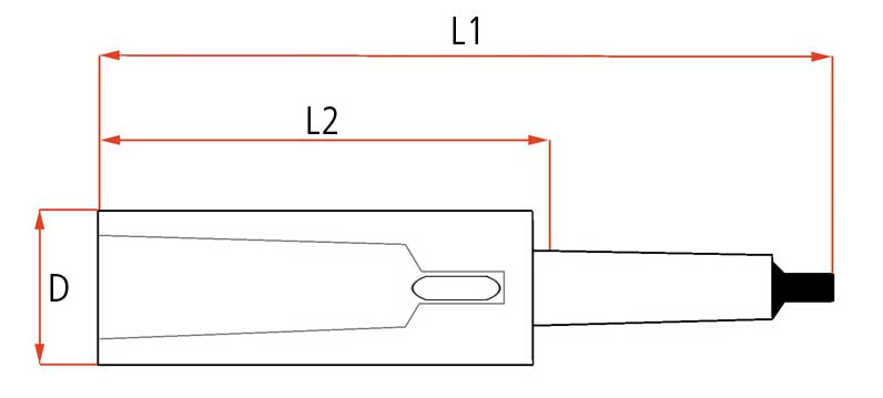 Förlängningshylsa MK 3 utvändigt, MK 4 invändigt. Totallängd (L1) 240 mm, utstick (L2) 145 mm, diameter (D) 48 mm. Härdad och slipad.