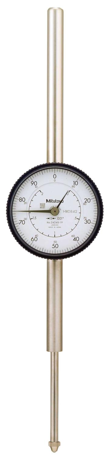 Indikatorklocka modell 2424A-19, mätområde 2 tum, avläsning 0,001´´. Vridbar skala. Diameter 57 mm. Med 9,52 mm/0,375´´-fäste och fästöra på baksidan. Noggrannhet enligt ANSI/AGD Standard. OBS! Mätspets gänga 4-48UNF. Ädelstenslagrat och stötsäkert.