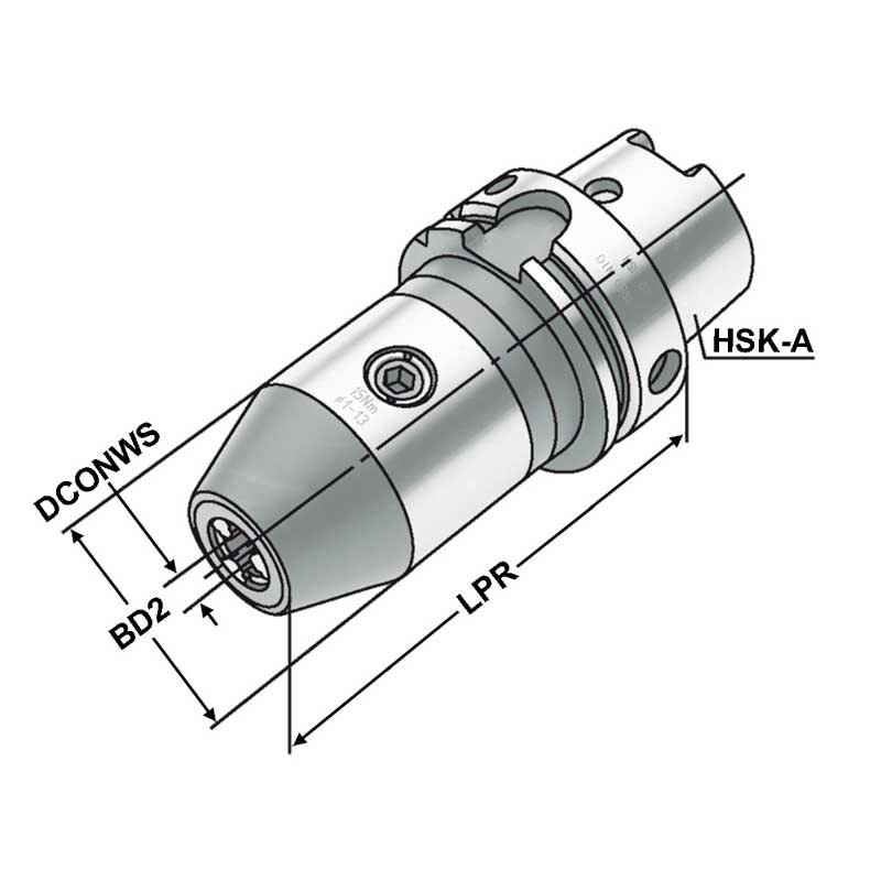 Integrerad CNC-borrchuck HSK-A 40 (ISO 121164-1/DIN 69893-1) i precisionsutförande för vänster/högergång, mekanisk kraftförstärkning. Låsning med insexnyckel 6 mm, medföljer ej. Spännområde 1-13 mm. Rundgångsnoggrannhet 0,03 mm. Mått utstick från spindelnos (LPR) = 121 mm, diameter chuck (BD2) = 50 mm. Balanserad G6,3 - max 15000 rpm.