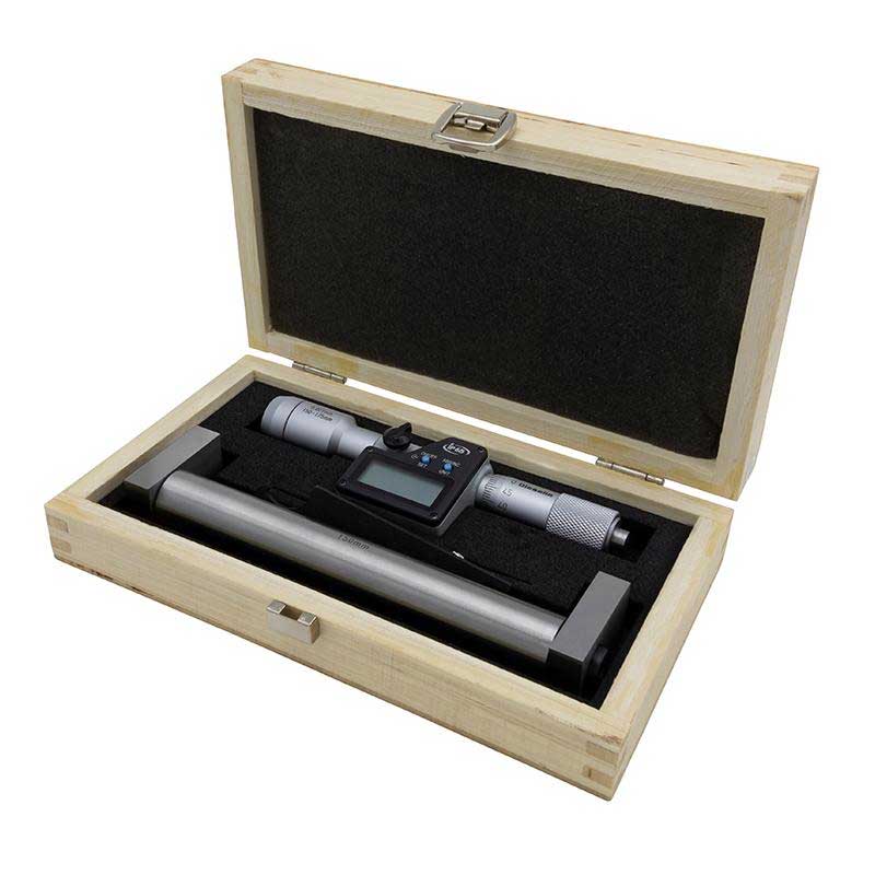 Digital mikrometer för intern mätning upp till 175 mm. Levereras i trälåda med inställningsmått. Mätområde 150-175 mm. Skyddsklass IP65. Noggrannhet +/- 0,007 mm.