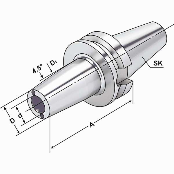 Krympchuck med kylkanaler, BT40 (JIS B6339, MAS-BT, form AD/B) för verktyg med 6 mm (h6) skaft. Balanserad G2,5 - max 25000 rpm. Rundgångsnoggrannhet <= 0,003 mm. Mått A 100 mm, D 21 mm, D1 27 mm,  I1 36 mm, l2 10 mm. För invändig kylning via spindel eller fläns.