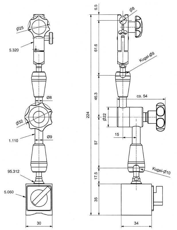 Kompakt magnetstativ av högsta kvalitet fabrikat Mitutoyo för indikatorklockor/vippindikatorer med mekanisk centralinställning och finjustering. Magnetkraft 30 kg. Mått magnet 34x30x35 mm, gänga M6. Totalhöjd 220 mm. Aktionsradie 130 mm. Vikt 0,45 kg. Infästning 8 mm och laxstjärt för vippindikator. Mitutoyo artikel 011533.