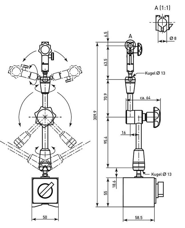 Magnetstativ av högsta kvalitet fabrikat Mitutoyo för indikatorklockor/vippindikatorer med mekanisk centralinställning och finjustering. Magnetkraft 75 kg. Mått magnet 60x50x55 mm, gänga M8. Totalhöjd 310 mm. Aktionsradie 200 mm. Vikt 1,55 kg. Infästning 8 mm och laxstjärt för vippindikator. Mitutoyo artikel 011358.