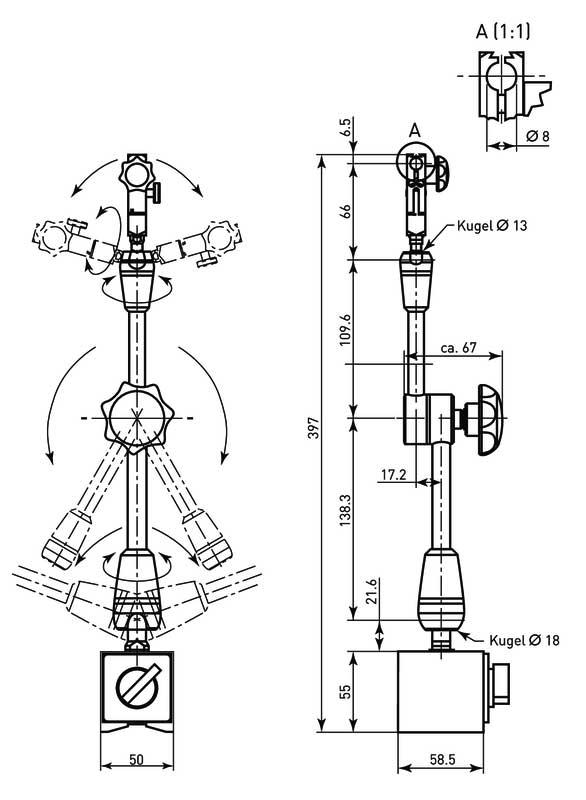Magnetstativ av högsta kvalitet fabrikat Mitutoyo för indikatorklockor/vippindikatorer med mekanisk centralinställning och finjustering. Magnetkraft 75 kg. Mått magnet 60x50x55 mm, gänga M8. Totalhöjd 397 mm. Aktionsradie 280 mm. Vikt 1,85 kg. Infästning 8 mm och laxstjärt för vippindikator. Mitutoyo artikel 011359.