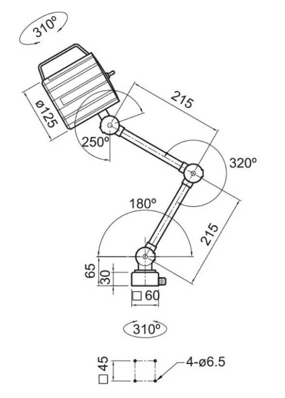 Ledbar maskinbelysning LED 12 W med två armar längd 215 + 215 mm. För spänning 24 V AC/DC. Ljusspridning 60°, ljusstyrka 1020 Lm, färgtemperatur 5700 Kelvin, färgåtergivning Ra >80. Material: aluminium. Kabellängd 1,8 meter utan stickpropp. Total höjd 620 mm. Monteringshål 4x6,5 mm (45x45 mm). Kapslingsklass IP 65.