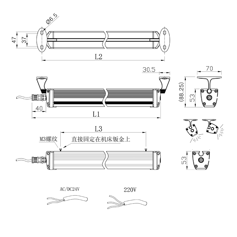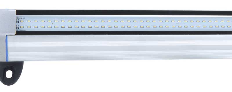 Maskinbelysning LED 16 W för fast montering med vridbart fäste. För spänning 100-240 V AC. Längd L1 680 mm. Ljusspridning 120°, ljusstyrka 1080 Lm, färgtemperatur 4000-4500 Kelvin, färgåtergivning Ra >80. Material: aluminium. Kabellängd 2 meter utan stickpropp. Kapslingsklass IP 65.