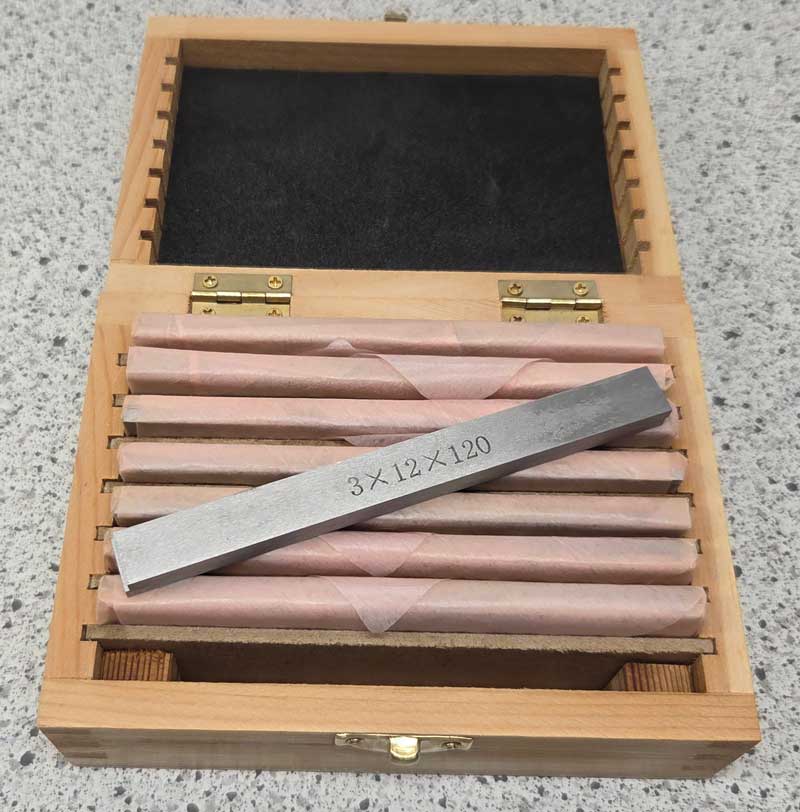 Sats med 16 st härdade och slipade parallellbitar. Parallellitet ± 0,005 mm. Matchade parvis. Längd 120 mm. Tjocklek 3 mm. Höjd 12, 17, 22, 25, 28, 32, 36, 38 mm. I trälåda.