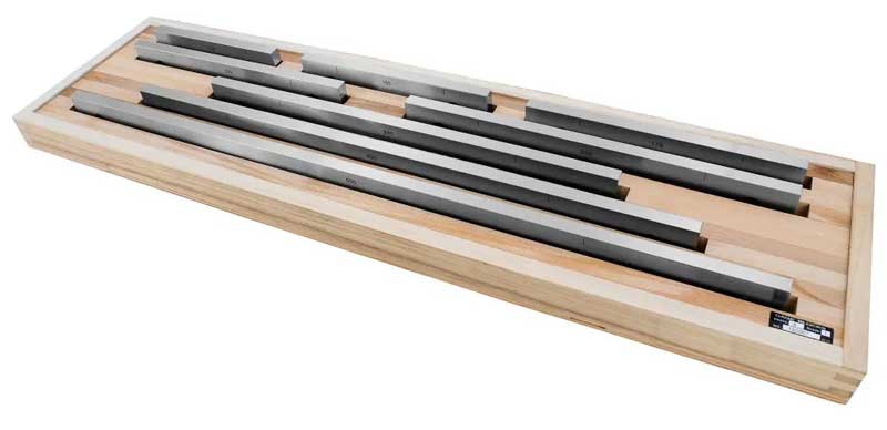 Noggrannhet enligt DIN EN ISO 3650. Långa, härdade passbitar i stål med läppade mätytor. I trälåda. 8 st.: 125, 150, 175, 200, 250, 300, 400 och 500 mm.