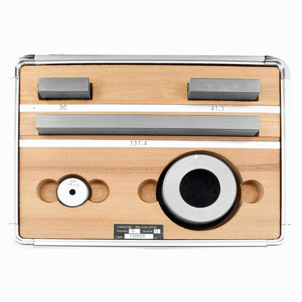 Kontrollmått för skjutmått Noggrannhet enligt DIN EN ISO 3650. Åldrade och härdade passbitar i stål med läppade mätytor. I låda. 3 st passbitar 30-41,3-131,4 mm och 2 kontrollringar ø4 och 25 mm. Med provningsprotokoll från tillverkaren.