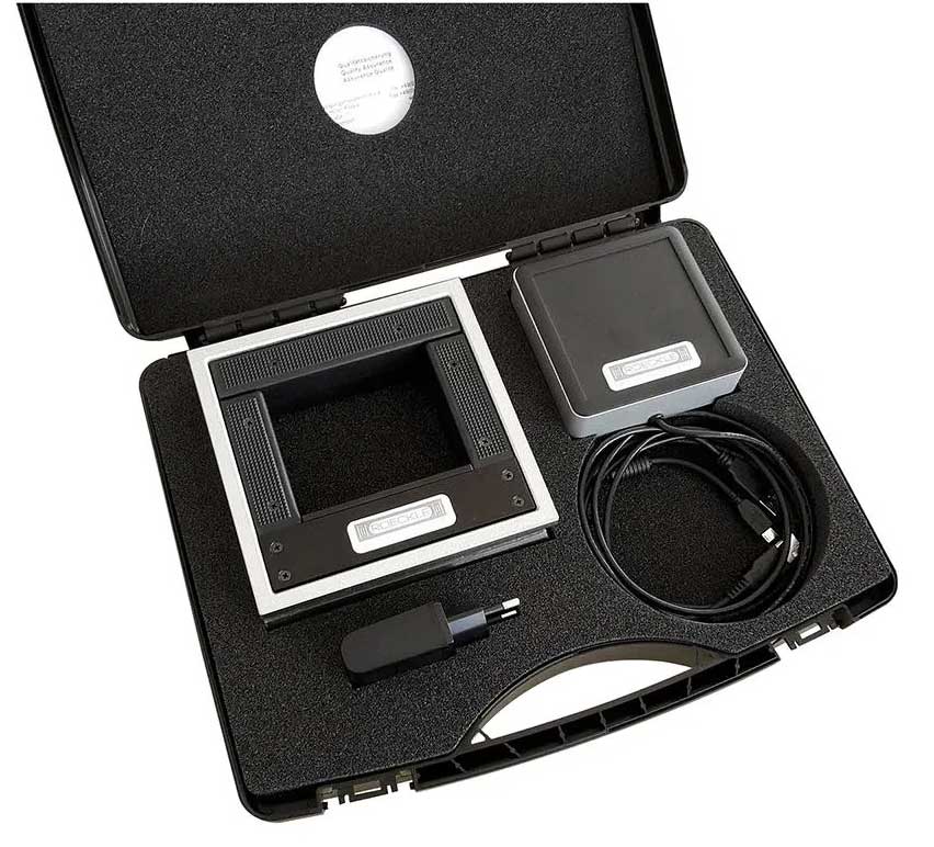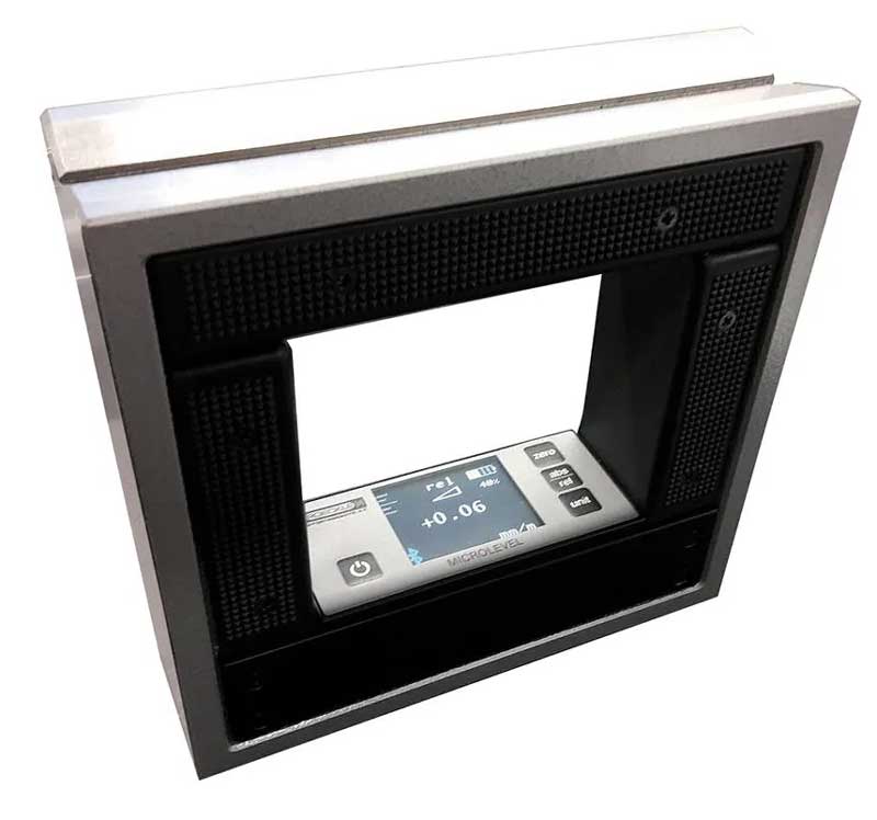 Digitalt maskinpass 150x150 mm av mycket hög kvalitet med avläsning 0,02 mm/m. Design: Stor belyst färgdisplay. Snabb avläsning och enkel att använda. Trådlös kommunikation. Fjärrvisning via smartphone. 10 timmars batteritid. Levereras i vadderat plastfodral. Funktioner: Absolut/relativ mätning, 13 olika enheter, horisontell och vertikal mätning, holdfunktion. Tillval, finns separat: programvara för visuell analys, mätprotokoll, dataexport i MS Excel, fjärrstyrning via smartphone eller PC via Bluetooth®. Användning: För exakt uppriktning av horisontella och vertikala ytor och axlar. Bredd 42 mm. Med tre prismatiska och en platt sida, finslipade mätytor, levereras i etui. Fabrikat Röckle, Tyskland.