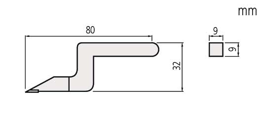 Hårdmetallbelagd reservspets till Mitutoyo höjdritsmått 192-130, 192-131, 192-132, 192-133,192-613-10, 192-614-10, 192-615-10, 514-102, 514-104, 514-106, 570-302, 570-304. Mått skaft 9x9 mm, längd 80 mm, höjd 32 mm.