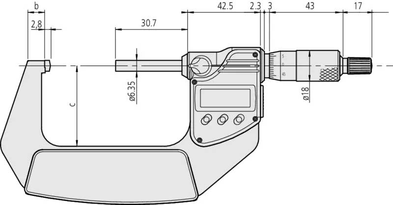 Digital Bygelmikrometer av högsta kvalitet för mätning av sfäriska ytor såsom väggtjocklekar på rör, lager, ringar m.m.. Mitutoyo Digimatic Mätområde 25-50 mm. Avläsning 0,001 mm, noggrannhet +/- 2 µm. Spindeldiameter 6,35 mm. Sfäriskt anslag och rak spindelmätyta. Mått D: 15 mm, b: 9,8 mm, c: 32 mm. Med automatisk avstängning efter 20 minuter. Batterilivslängd ca 2,4 år. Batteri SR44. Inklusive etui, nyckel, 1 batteri samt inställningsmått. Skyddsklass IP65.