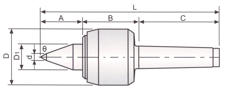 Förlängd spets för god åtkomlighet. Kullagrad, härdad och slipad. Mått A:53 mm, B:56 mm, C:107 mm, D:70 mm, D1:32 mm, d:14 mm, L:217 mm. Max. spännkraft: 500 kg. Max. varvtal 2800 rpm. Rundgångsnoggrannhet 0,006 mm.