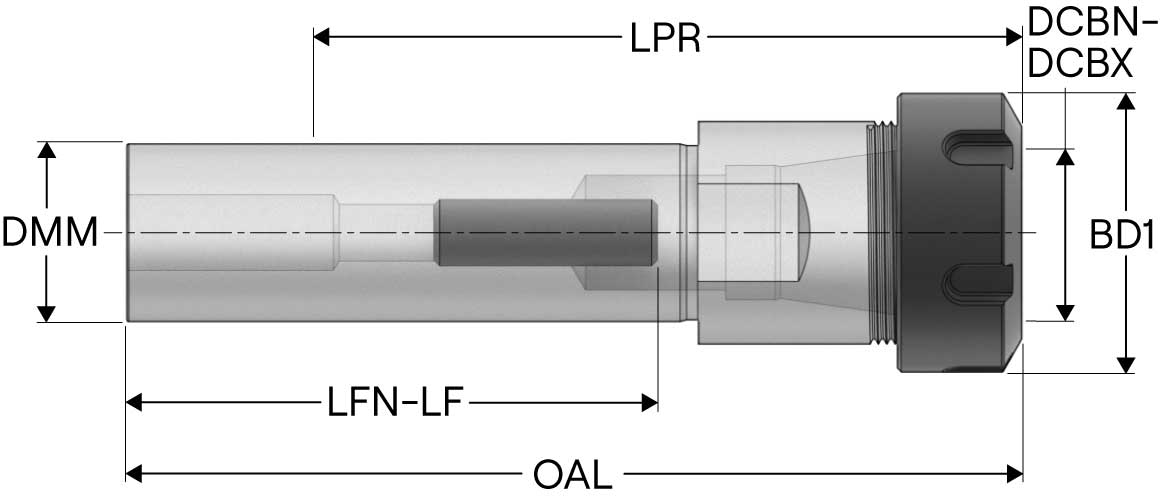 Spännhylschuck SECO Tools modell ST12-ER08R-150 (10229738) för ER8-hylsor (1-5 mm) med cylindriskt skaft, genomgångshål för invändig kylning, med mutter. Skaftdiameter 12 mm, skaftlängd 112 mm, totallängd 150 mm. Mutter diameter 12 mm. Illustrationerna kan variera från aktuell produkt.