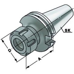 Spännhylschuck SK30 (DIN 69871, form AD) för ER25-hylsor. Balanserad G6,3 - max 15000 rpm. Rundgångsnoggrannhet <= 0,003 mm. A = 70 mm, D = 42 mm. Nyckel ingår ej. För invändig kylning via spindel.