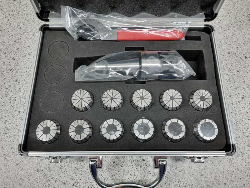 Komplett med chuck, mutter, nyckel och 11 st hylsor 3-4-5-6-8-10-12-14-16-18-20 mm. I låda. Enligt DIN 6499.