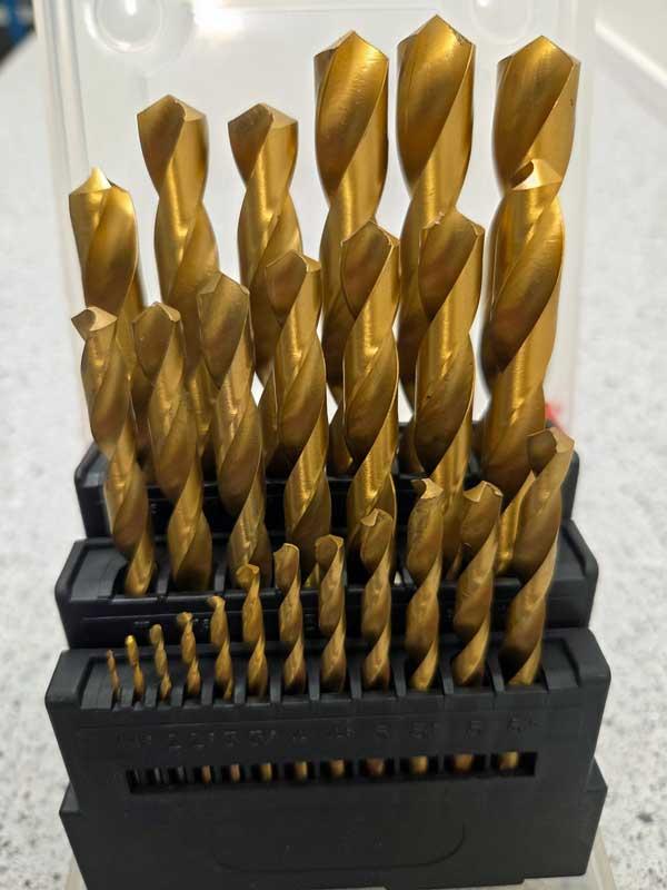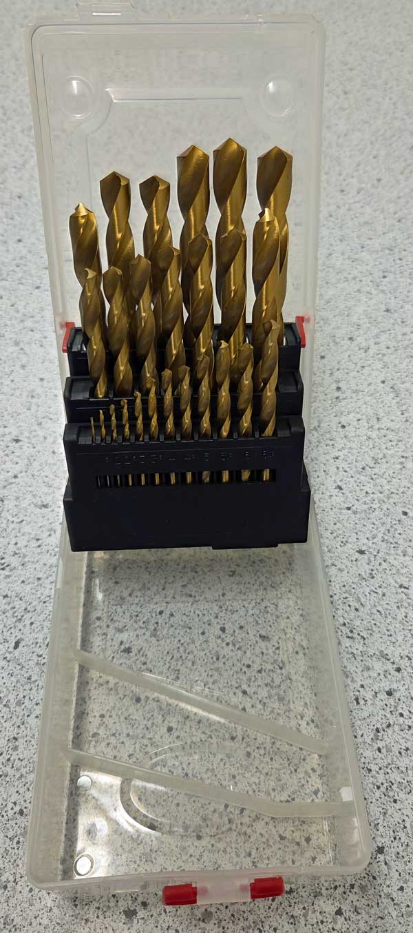 25 st slipade TiN-belagda HSS-borr i plastlåda. 1-13 mm med 0,5 mm intervall. Enligt DIN 338, spetsvinkel 118°.