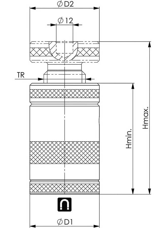 Justerbar stöddocka med magnetfot för både horisontell och vertikal montering. Höjd 52-62 mm. Diameter 50 mm. Max belastning 100 kN. Gänga TR30x4.