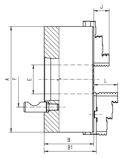Självcentrerande 3-backchuck av stål modell 3544-160/5, med fäste Camlock D1-5. Levereras med invändiga och utvändiga backar, chucknyckel. Diameter (A) 160 mm, höjd (B) 68 mm, genomgång (E) 42 mm, F 104,8 mm (6 st), J 32 mm. Vikt 9 kg. Max 4600 rpm.
