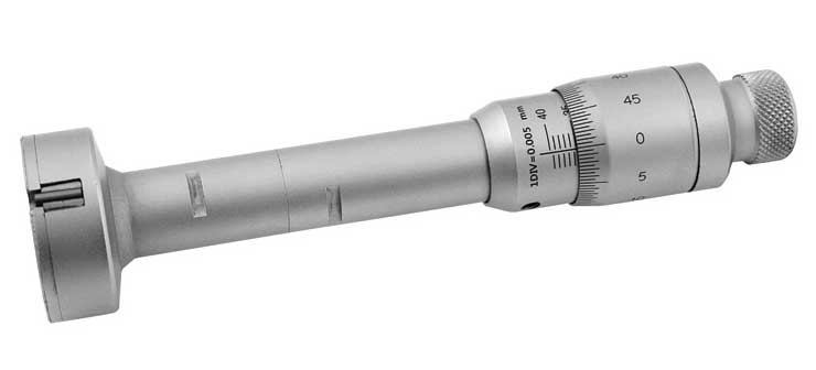 Trepunktsmikrometer av hög kvalitet. Mätytor av hårdmetall. Avläsning 0,005 mm, noggrannhet +/- 0,004 mm. Mätdjup 80 mm. OBS! levereras utan inställningsring, se artikelnummer DS10283155.