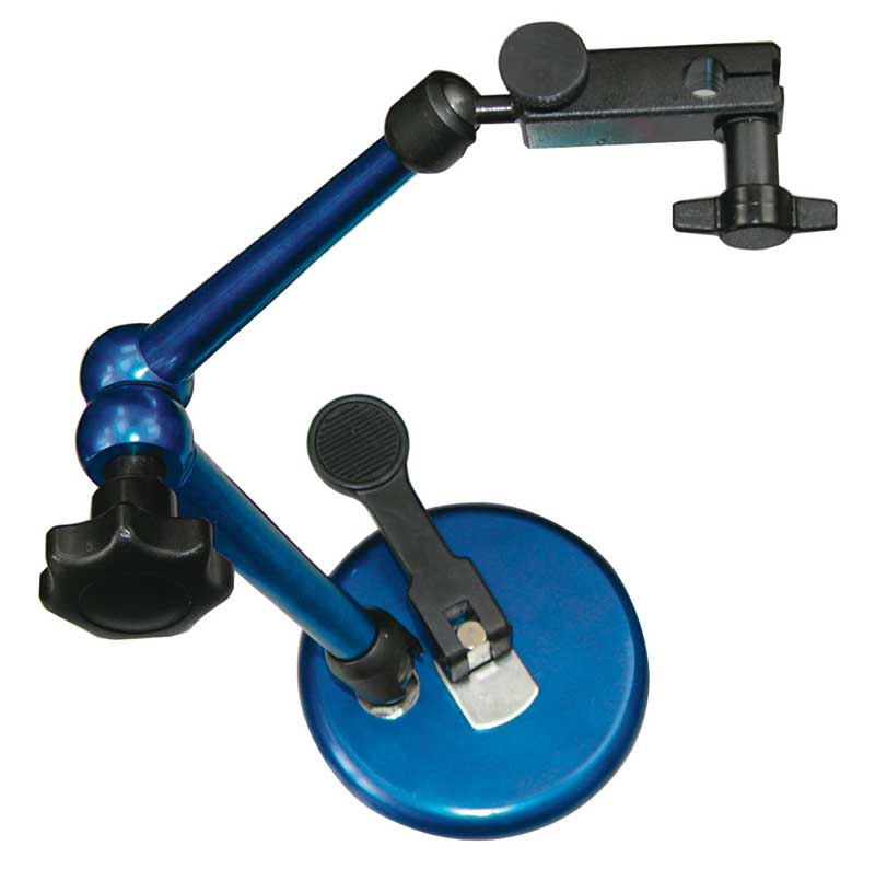 Vacuummätstativ med centrallåsning och fininställning, användbar för omagnetiska ytor som granitplanskivor, mässing, rostfritt stål, glas m.m. Diameter fot 90 mm, armar räckvidd 256 mm. Vikt 0,75 kg.
