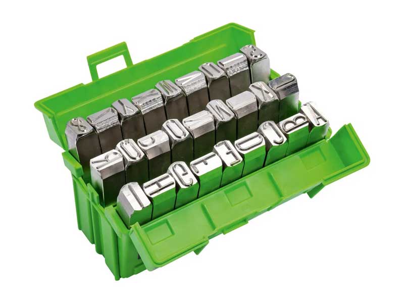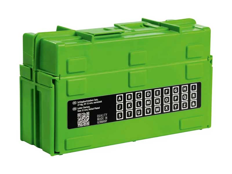 Stora bokstäver A-Z, &, för märkning av detaljer, induktionshärdade, nickelpläterade, i plastlåda. För material upp till 1200 N/mm2. Texthöjd 12 mm. Ger rättvänd text. Tillverkade i Tyskland.