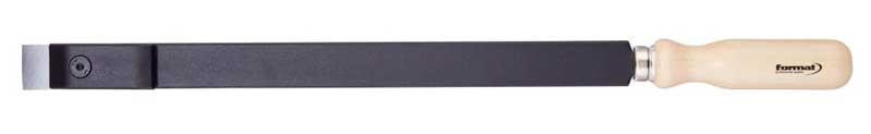 Utbytbar hårdmetallplatta med fyra eggar, lackerat skaft och trähandtag. Bladbredd 25 mm, totallängd 455 mm.